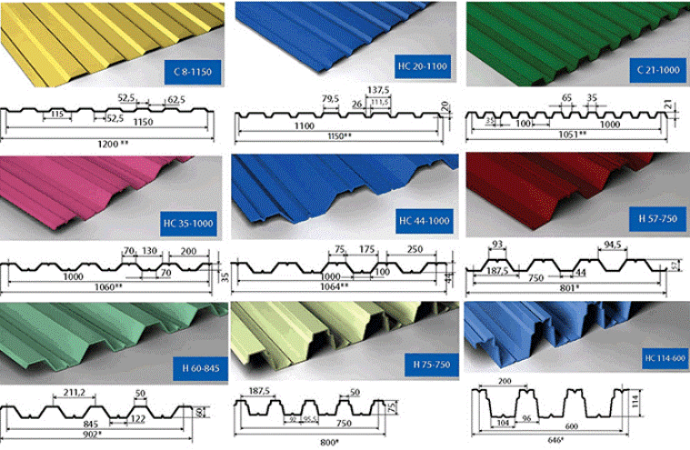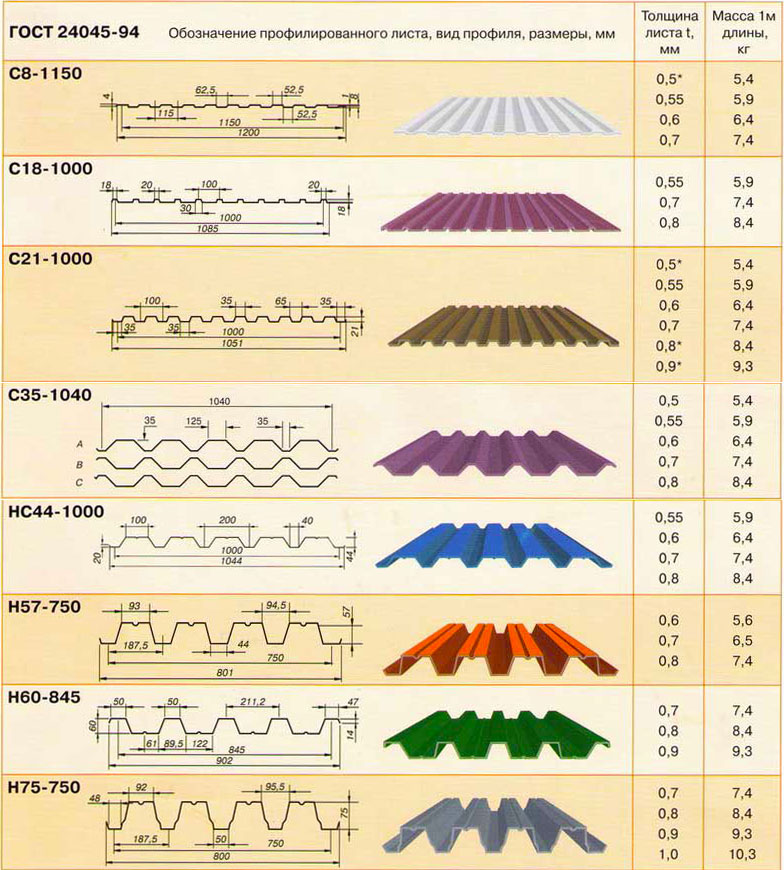 Зная это, вы без труда прочитаете любую маркировку профнастила. Так, например, маркировка С21-0,5-750-11000 обозначает стеновой профлист (С) с высотой волны 21 мм, шириной 750 мм и максимальной длиной листа 11 метров.