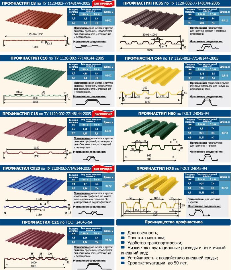 Существует несколько разновидностей профнастила, рассмотрим основные, которые определяют его эксплуатационные качества забора и внешний вид.