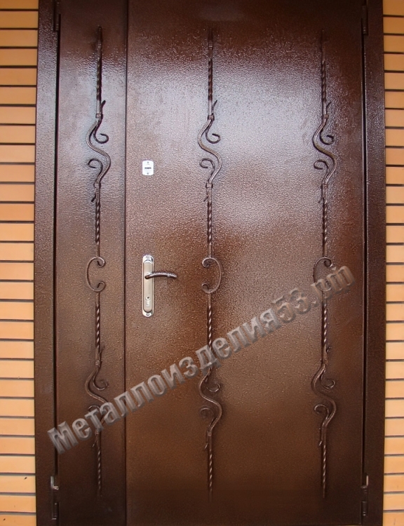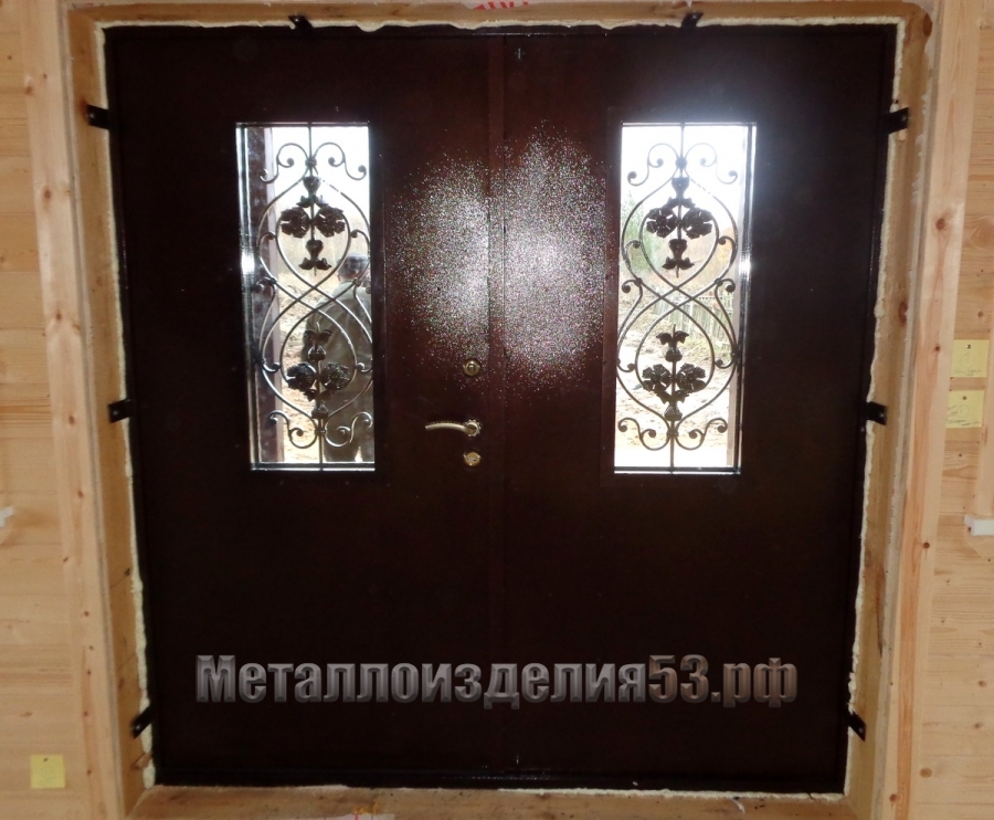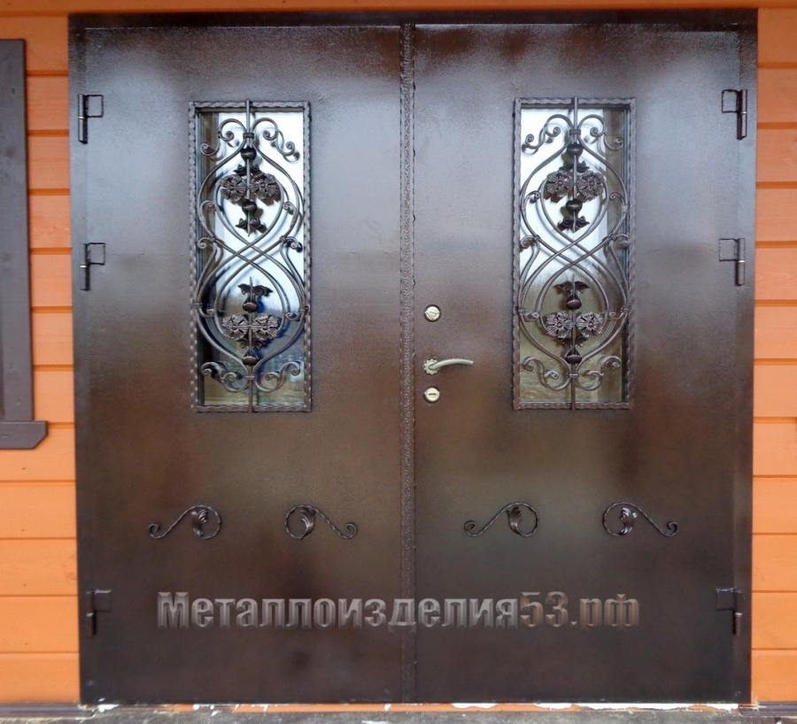 Двери входные двустворчатые с ковкой, покраска порошок